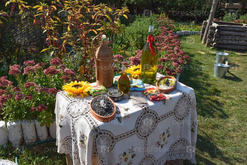 Импровизированный стол с самогоном и семечками