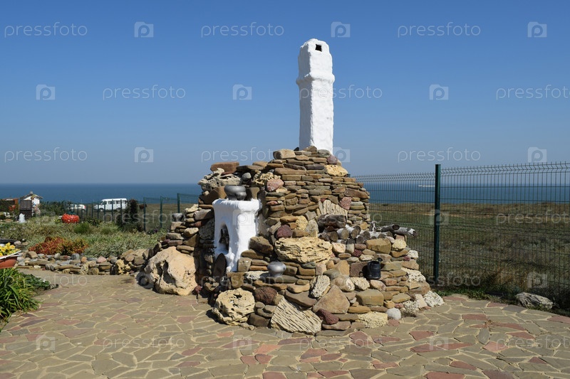 Наружная побеленная печь с высоким дымоходом, облицованная галькой и ракушечником