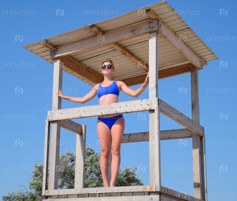 Женщина в синем купальнике на сторожевой вышке спасателей на пляже