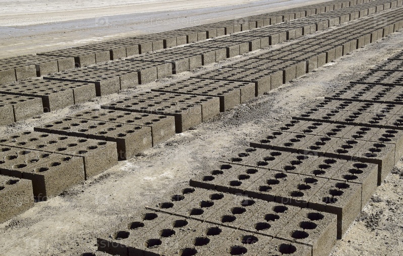 Шлакоблоки лежат на земле и высыхают. на заводе по производству шлакоблоков