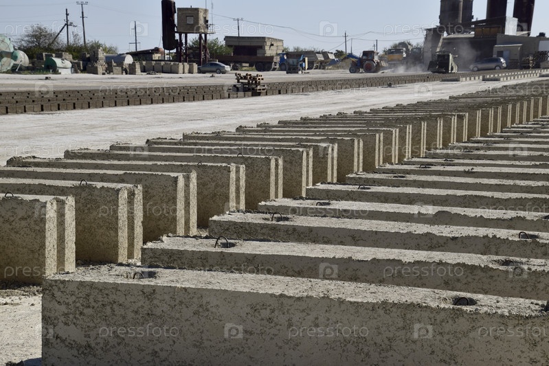Шлакоблоки лежат на земле и высыхают. на заводе по производству шлакоблоков
