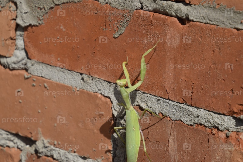 Богомол карабкается по кирпичной стене