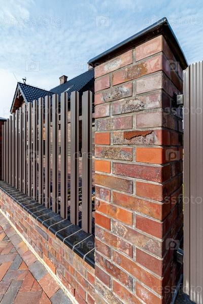 Фрагмент современного забора, облицованного декоративным кирпичом в старинном стиле