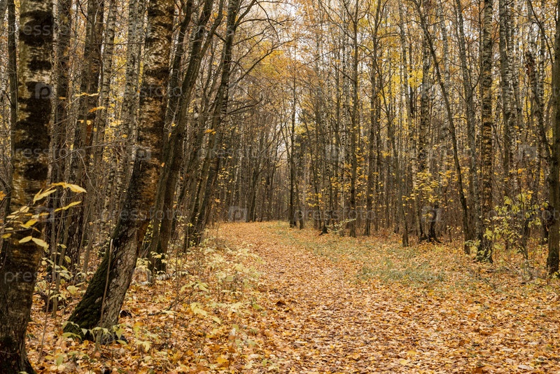 Тропинка в осеннем лесу среди деревьев и опавших золотых листьев на земле
