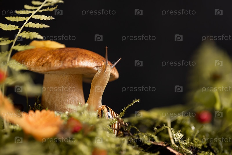 Милая улитка с полосатой раковиной ползает вокруг большого гриба подосиновика, растущего сквозь мох и опавшие листья в лесу