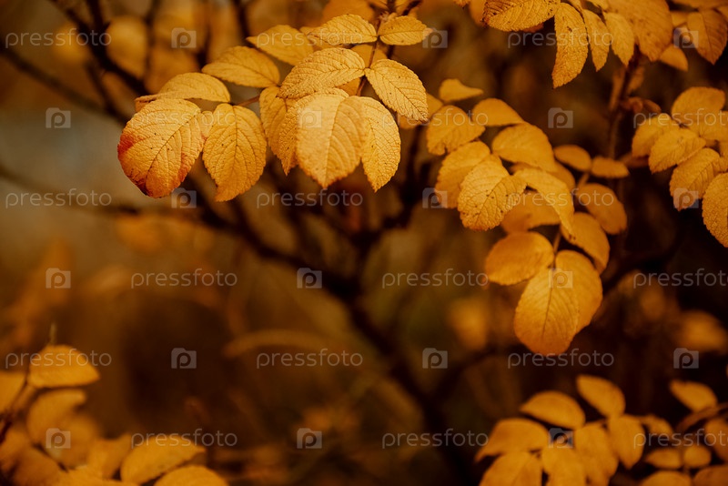 Желтые листья дикого шиповника на размытом осеннем фоне