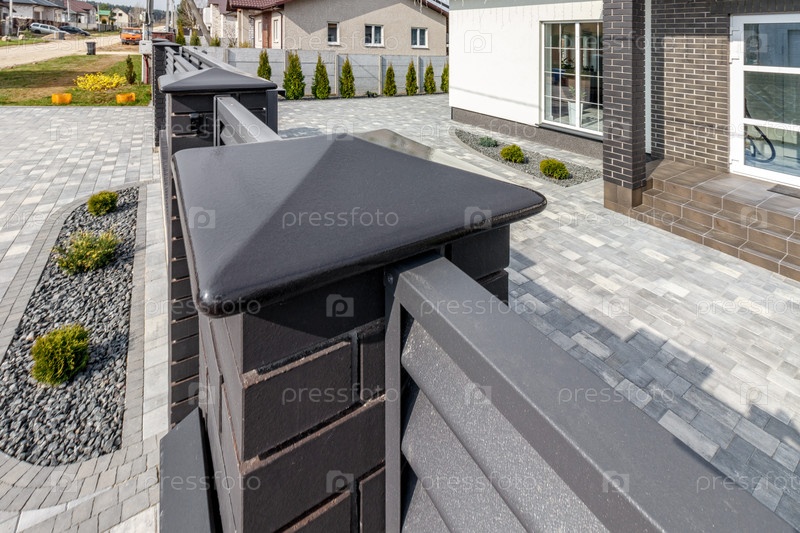 Фрагмент современного забора, облицованного декоративным кирпичом в старинном стиле
