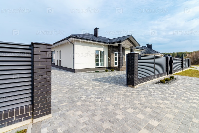 Фрагмент современного забора, облицованного декоративным кирпичом в старинном стиле