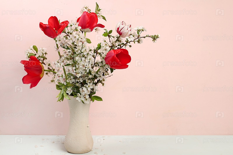 Домашний интерьер с элементами декора, красивые весенние вишневые ветки и тюльпаны в вазе на светлом фоне, абстрактная цветочная композиция, натюрморт с местом для текста, цветочная открытка на день рождения, свадьба, выборочный фокус, цветочный фон