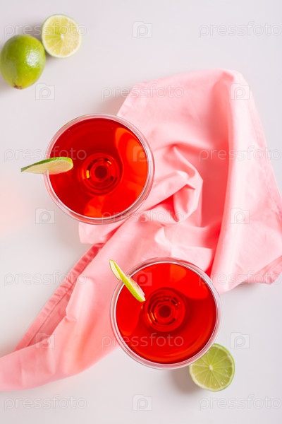 Алкогольный космополитический коктейль в стаканах и лайме на столешнице и вертикальный вид