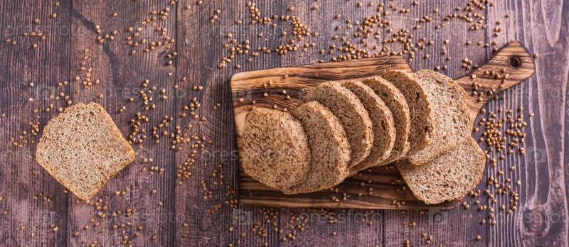 Кусочки домашнего гречневого хлеба на разделочной доске на веб-баннере с видом на стол
