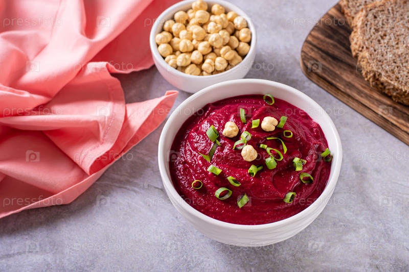 Чаша овощного свекольного хумуса с нутом и зеленью на столе