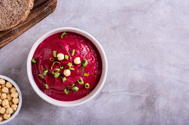 Свекольный хумус в миске, хлеб и нут на столе, вид сверху