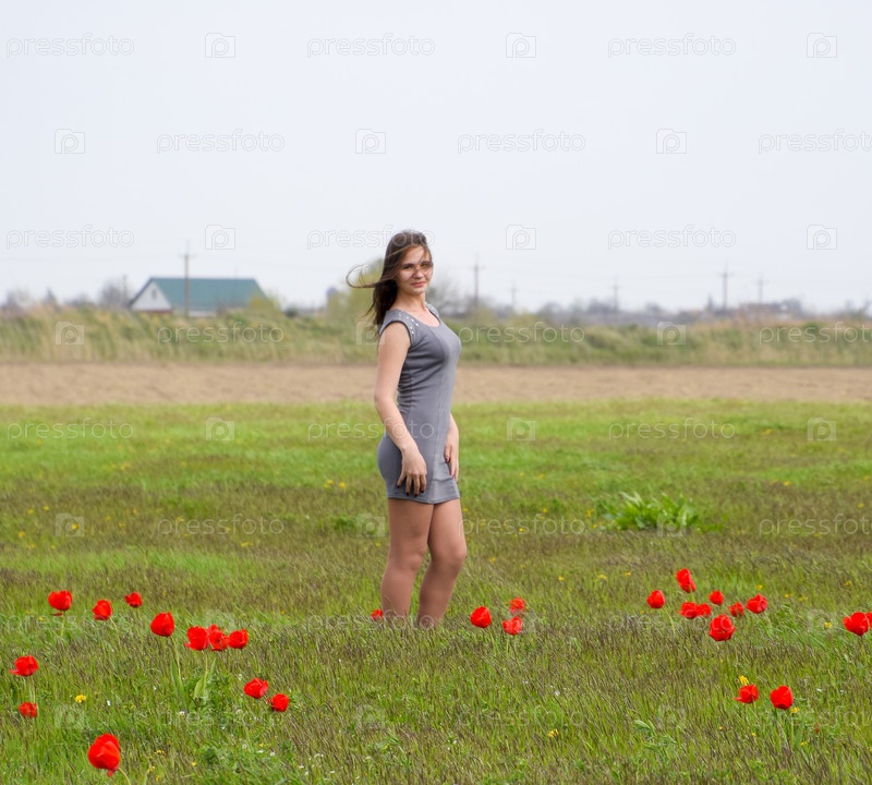 Красивая фея молодая девушка в поле среди цветов тюльпанов. Портрет девушки на фоне красных цветов и зеленого поля. Поле тюльпанов