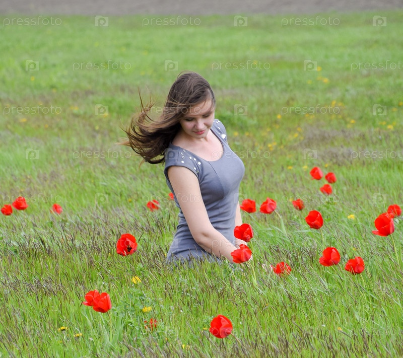 Красивая фея молодая девушка в поле среди цветов тюльпанов. Портрет девушки на фоне красных цветов и зеленого поля. Поле тюльпанов