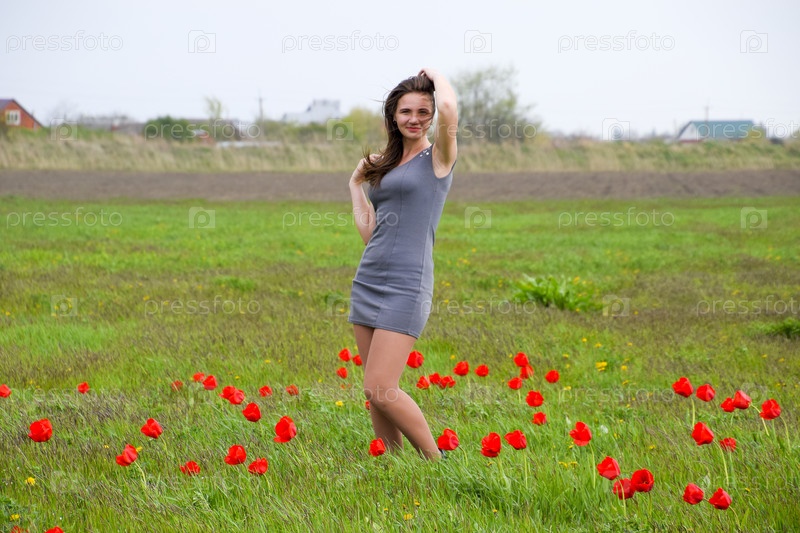 Красивая фея молодая девушка в поле среди цветов тюльпанов. Портрет девушки на фоне красных цветов и зеленого поля. Поле тюльпанов