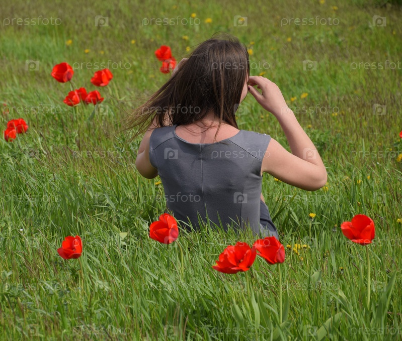 Красивая фея молодая девушка в поле среди цветов тюльпанов. Портрет девушки на фоне красных цветов и зеленого поля. Поле тюльпанов