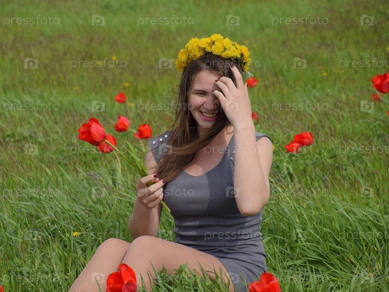 Девушка с венком из одуванчиков на голове. Красивая фея молодая девушка в поле среди цветов тюльпанов