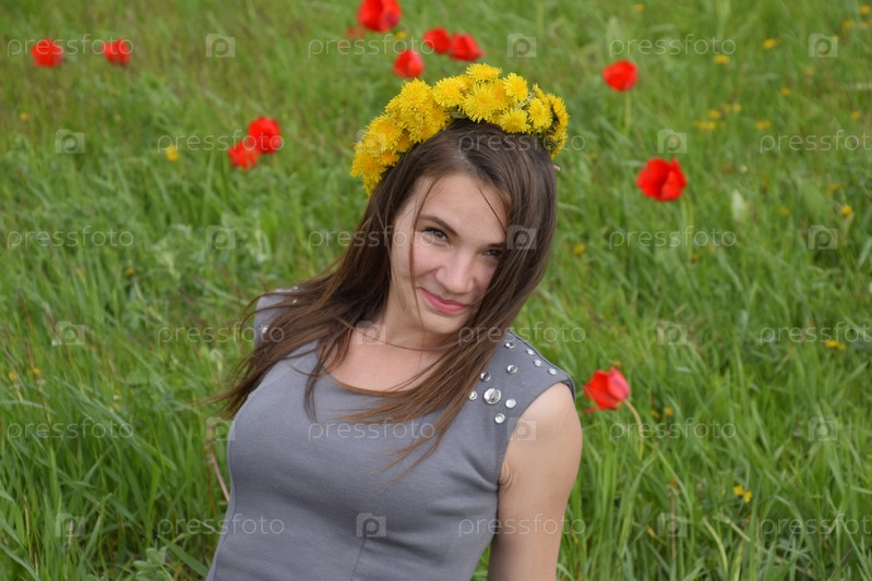Девушка с венком из одуванчиков на голове. Красивая фея молодая девушка в поле среди цветов тюльпанов