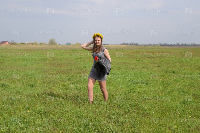 По зеленому полю идет девушка с венком на голове из одуванчиков
