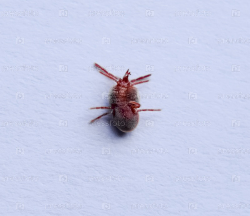 Красный бархатный клещ на белом листе бумаги. Макросъемка бархатного гипсового клеща