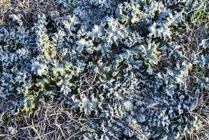 Листья травы со снегом. Замерзшая земля. Фон почвы и снега
