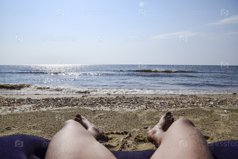 Ноги мужчины на фоне пляжа. Мужчина лежит на аматрасе на пляже и отдыхает. Ноги в кадре
