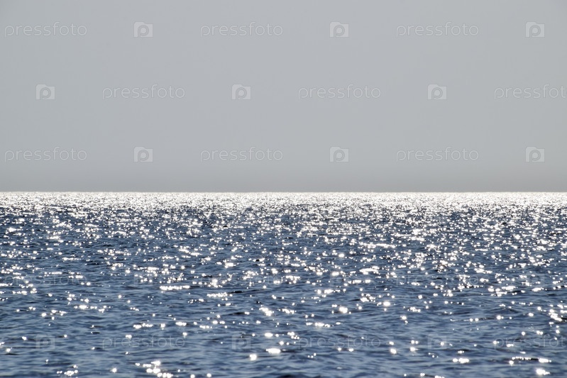 Морская линия горизонта. Море и небо. Волны и блики солнца отражаются от морских волн. Морской пейзаж