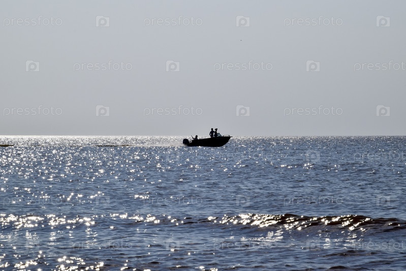 Лодка мчится по морю. В лодке люди. Морской пейзаж вечером. Силуэт моторной лодки и людей в ней на фоне морской дали