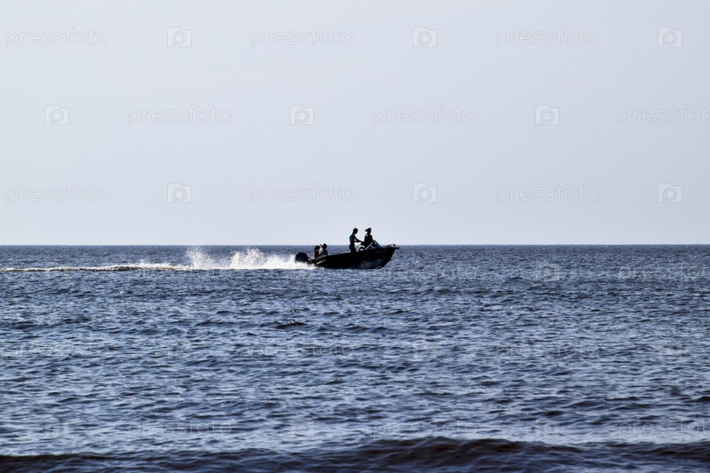 Лодка мчится по морю. В лодке люди. Морской пейзаж вечером. Силуэт моторной лодки и людей в ней на фоне морской дали