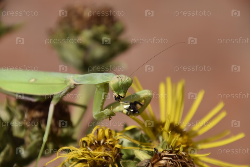 Самка богомола пожирает осу