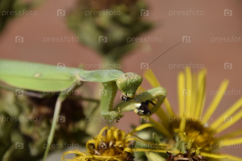 Самка богомола пожирает осу