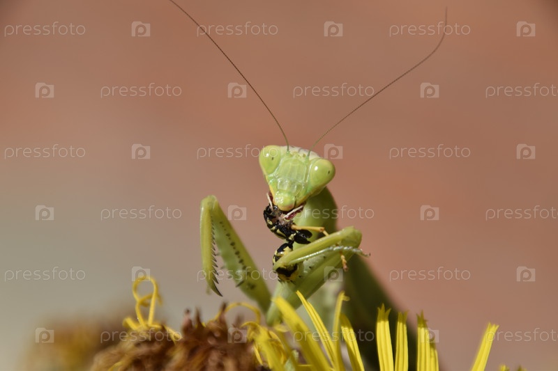Самка богомола пожирает осу