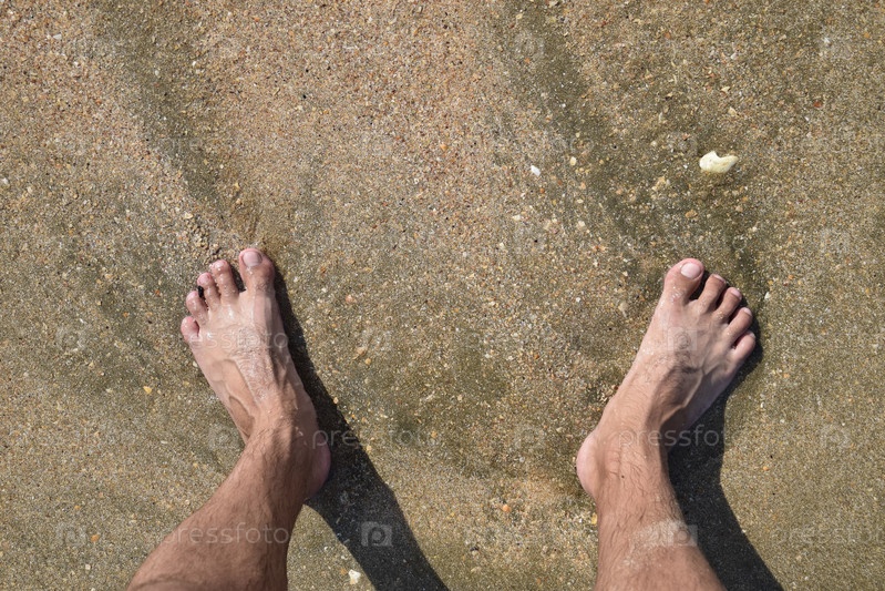 Ноги мужчины на морском песке возле морской волны