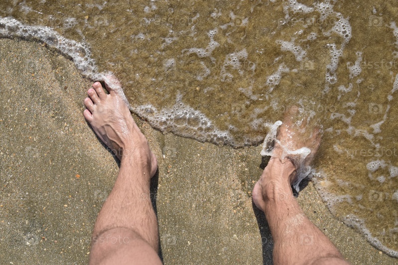 Ноги мужчины на морском песке у морской волны