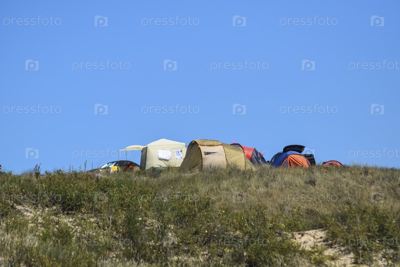 Туристические складные палатки среди прибрежной растительности. Палатка современная