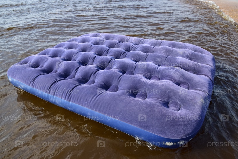 Синий надувной матрас плавает в пруду