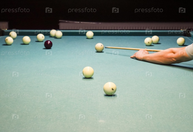 Бильярд, бильярдный стол. Нацеливание кия на мяч для чертенка