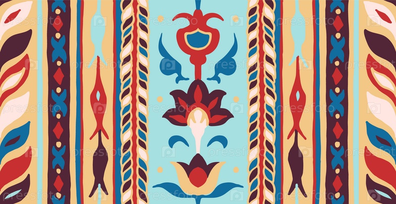 Геометрический дамасский орнамент. Икат границы. Этническая вышивка с листьями и монограммами. Племенная векторная текстура. Бесшовный народный узор в ацтекском стиле. Индийский, скандинавский, цыганский, мексиканский, африканский ковер