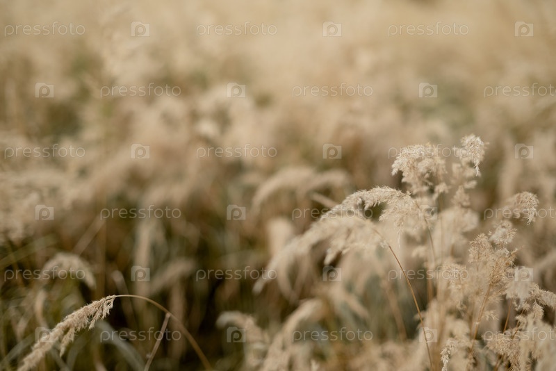 Сухая пушистая травинка в поле осенью на солнечном желтом фоне