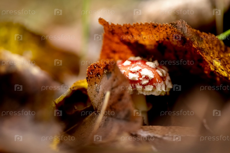Ядовитый гриб Amanita muscaria, растущий из-под упавших листьев в осенних лесах