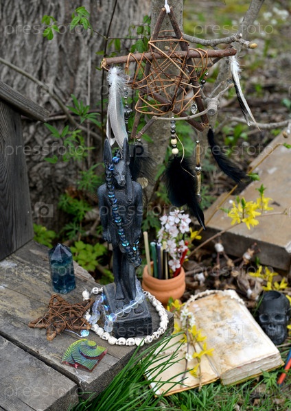 Статуя Анубиса, волшебная книга заклинаний и пентаграмма на алтаре ведьм. Оккультный, эзотерический и гадальный натюрморт. Мистический внешний фон со старинными предметами