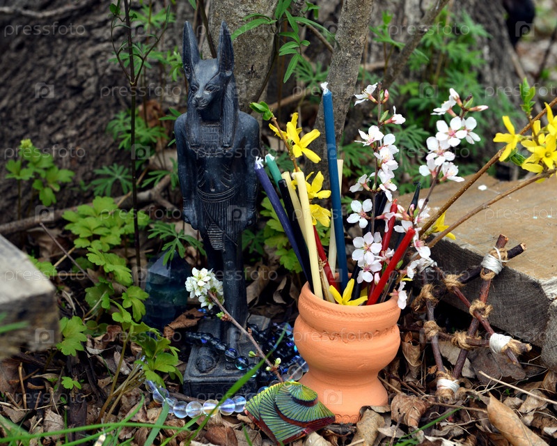 Фигурка бога Анубиса Египта со свечами и цветами на ритуальном алтаре. Оккультный, эзотерический и гадальный натюрморт. Мистический внешний фон со старинными предметами