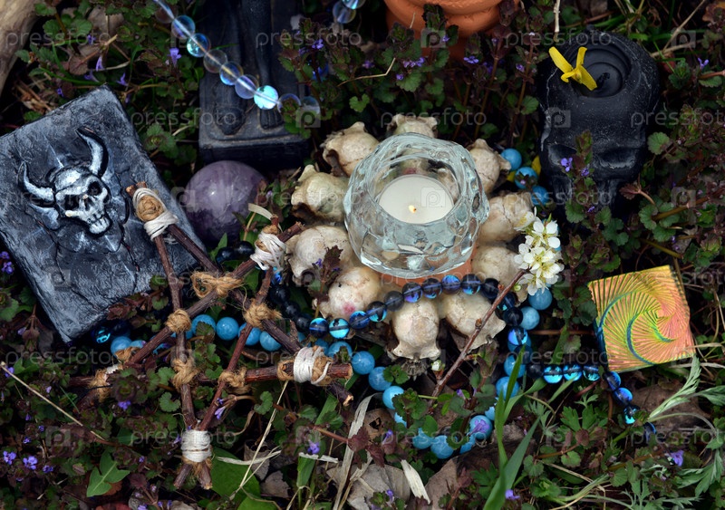 Волшебные книги со свечами, кристаллами и пентаграммой на алтаре ведьм в саду. Оккультный, эзотерический и гадальный натюрморт. Мистический внешний фон со старинными предметами
