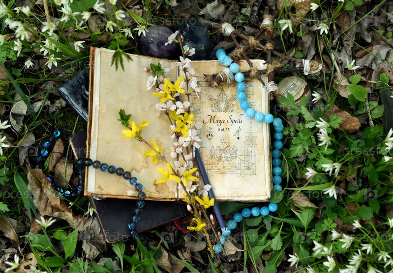 Откройте волшебную книгу заклинаний с кристаллами на траве в саду. Оккультный, эзотерический и гадальный натюрморт. Мистический внешний фон со старинными предметами