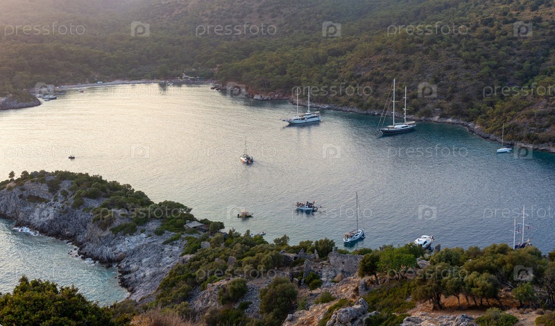 Морская бухта с кораблями на закате. Остров Святого Николая, Турция