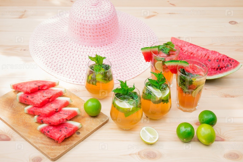 Коктейль из арбузного мохито, коктейль из мохито, арбуз, лаймы и шляпа на деревянном столе