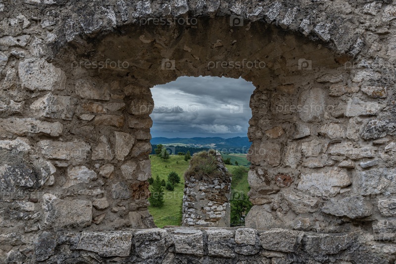 Вид на горы сквозь бойницу старой крепости