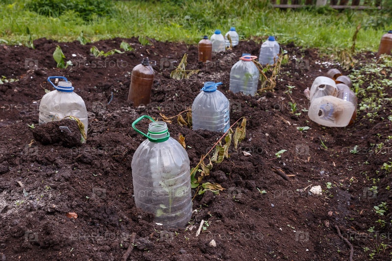 Ростки молодых растений, покрытые пластиковой бутылкой в огороде. Посадка овощей в огороде. Выращивание овощей