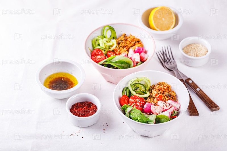 Свежий салат с кускусом, помидорами, огурцом, редисом и мангольдом